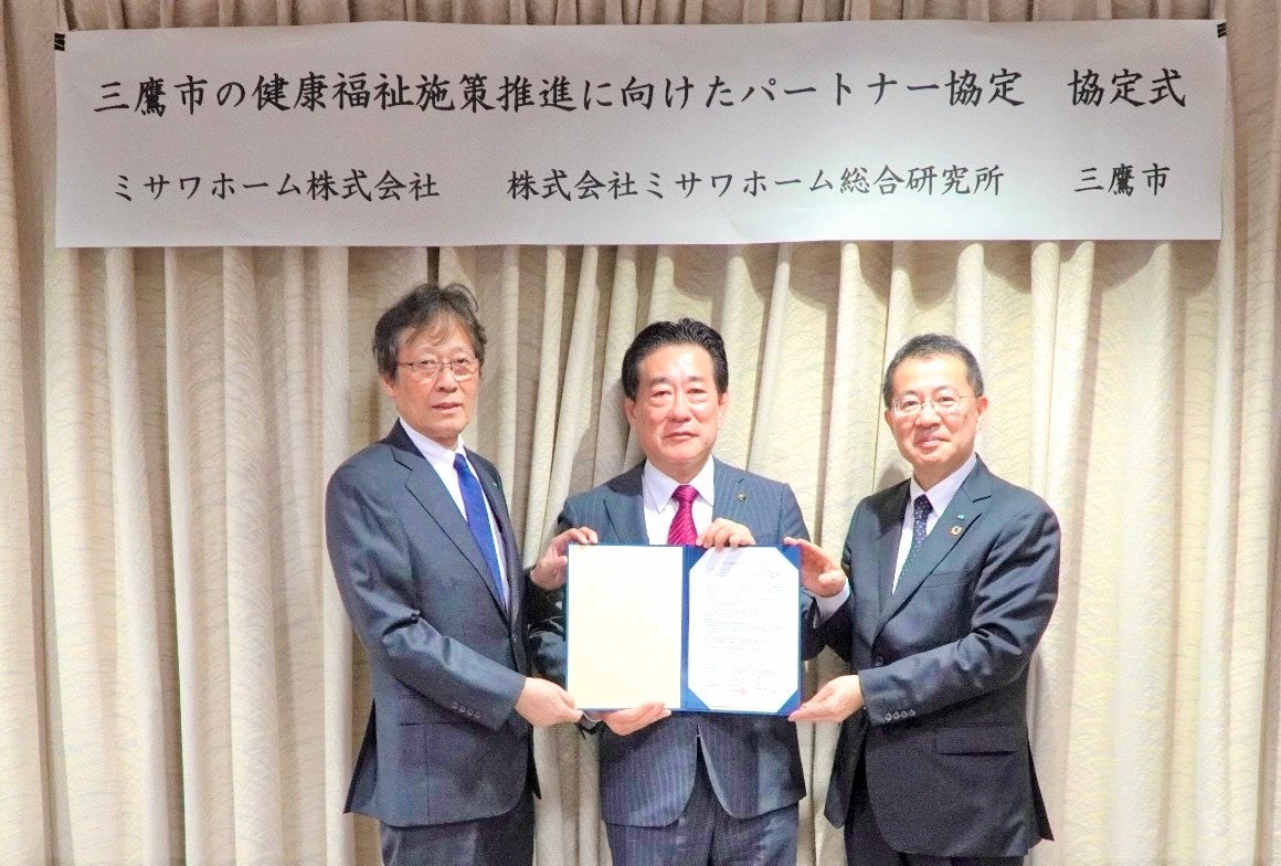 ミサワホーム株式会社(代表取締役社⾧執行役員 作尾徹也)と株式会社ミサワホーム総合研究所(本社 東京都杉並区/代表取締役社⾧ 千原勝幸)は東京都三鷹市(市⾧ 河村孝)と「三鷹市の健康福祉施策推進に向けたパートナー協定(以下、本協定)」を2024年5月1日に締結いたしました。同日、三鷹市役所で本協定締結式が執り行われました。今後3者による産官連携のもと、「三鷹市福祉Laboどんぐり山」を主な拠点に、高齢者が在宅生活をおくるうえでのソリューション提案に向けてさまざまな検証等を協働で行います。