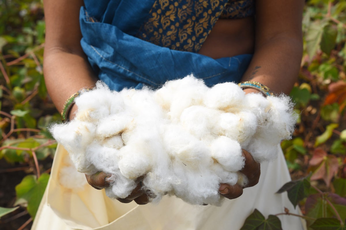 オーガニックフィールドは、インドの綿花農家が農薬や化学肥料に頼らないオーガニック農法へと転換していくプロセスをサポートする取り組みです。環境負荷の低減と綿花農家の労働環境の改善を目指し、オーガニック農法への移行期に収穫される「コットン・イン・コンバージョン」と呼ばれる綿花を買い取ることで、農家の挑戦を支えています。