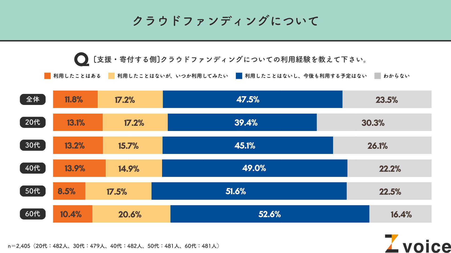 Z世代向けの企画・マーケティングを行う『僕と私と株式会社』は、全国の20代~60代の男女2,405人を対象に、クラウドファンディングに関する意識調査を実施しました。