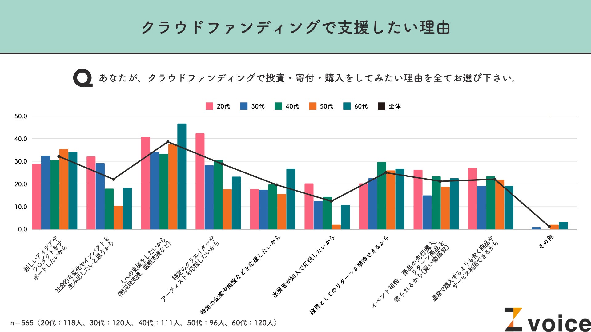 先の「支持するクラウドファンディングの種類」で20代から「寄付型」の支持が高かったことも踏まえると、明確にリターンを得ることに重きを置かず、「共感できるから支援する」といったエモ消費や、推し活に近い背景があるのかもしれません。
