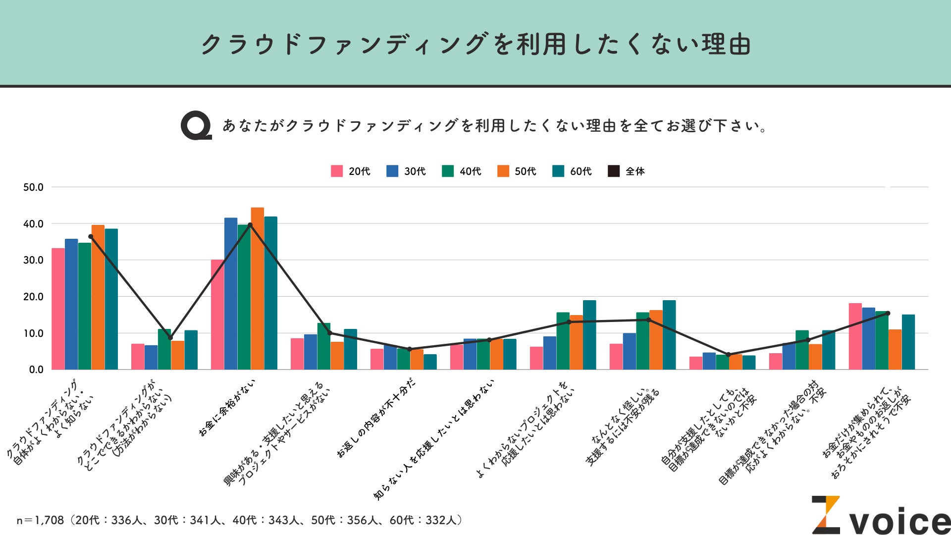 次に、クラウドファンディングについて「利用したことはないし、今後も利用する予定はない」と答えた1,708人に利用したくない理由を聞いてみました。