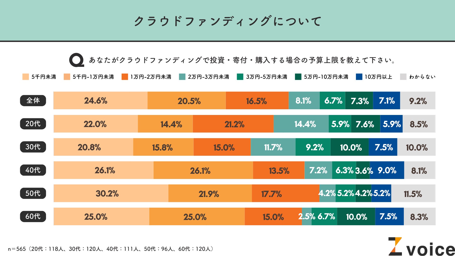 最後に、クラウドファンディングにかける予算上限を聞いたところ、全体でもっとも多かったのが「5千円未満」で24.6%、続いて「5千円〜1万円未満」で20.5%という回答になり、およそ過半数が1万円未満という結果になりました。
