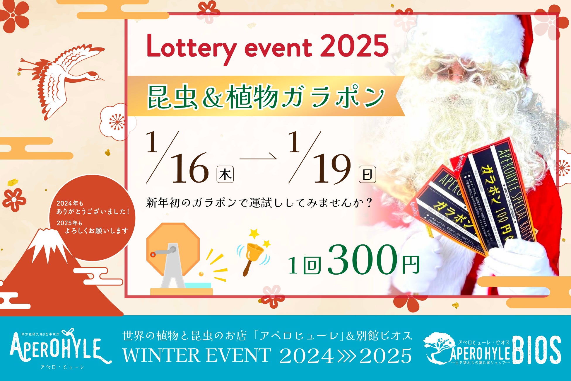 1/16(木)~1/19(日)の3日間毎年恒例1回300円の昆虫&植物ガラポンも開催します!