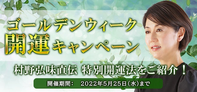 『村野弘味の占い』では「ゴールデンウィーク開運キャンペーン」が開催中です。期間中、対象鑑定を購入した方限定で、『村野弘味直伝 特別開運法』をご紹介いたします。手軽にできる開運法となっておりますので、ぜひこの機会に良い運気を呼び込み、5月の運気を高めましょう!