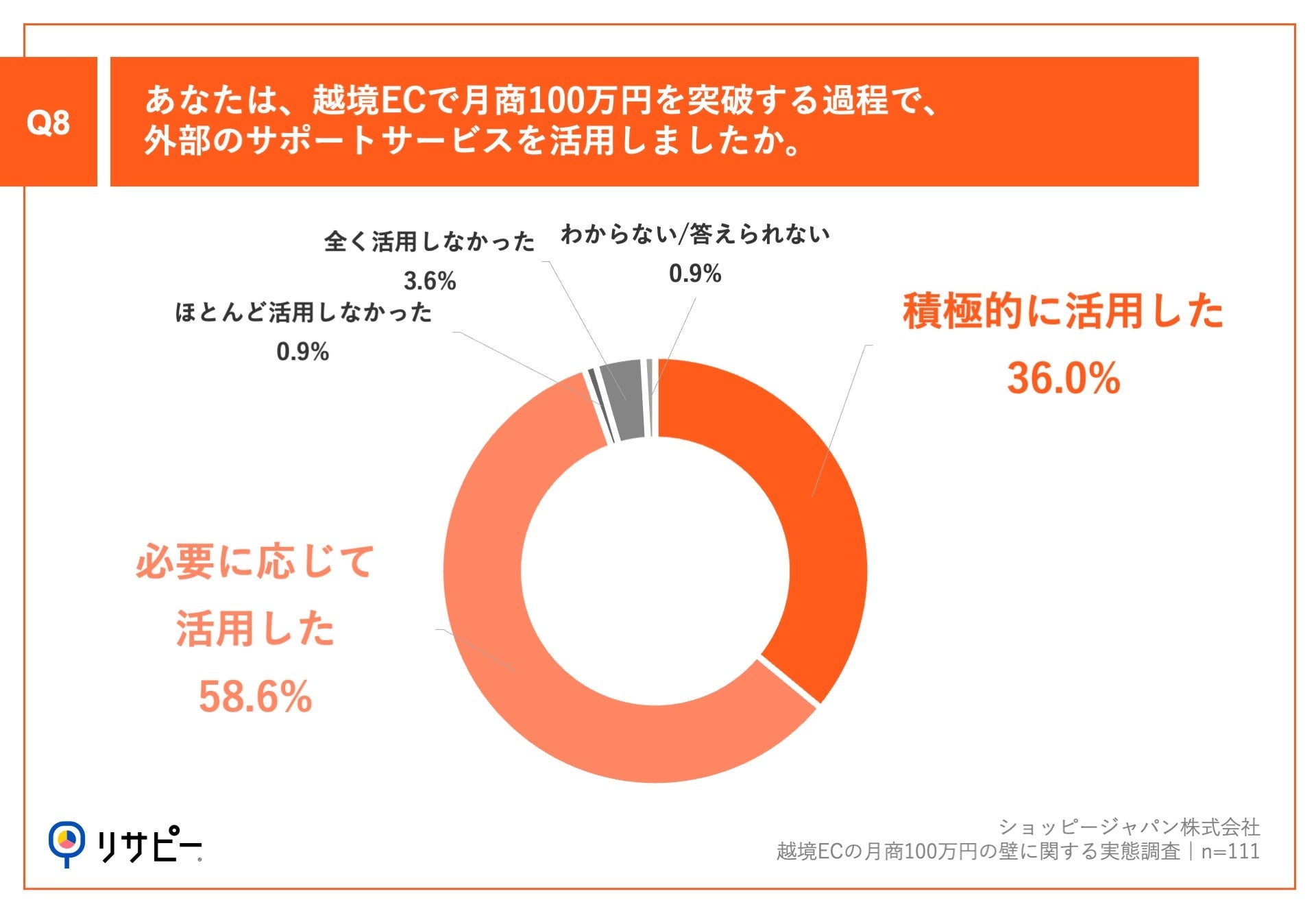 「Q8.あなたは、越境ECで月商100万円を突破する過程で、外部のサポートサービスを活用しましたか。」(n=111)と質問したところ、「積極的に活用した」が36.0%、「必要に応じて活用した」が58.6%という回答となりました。