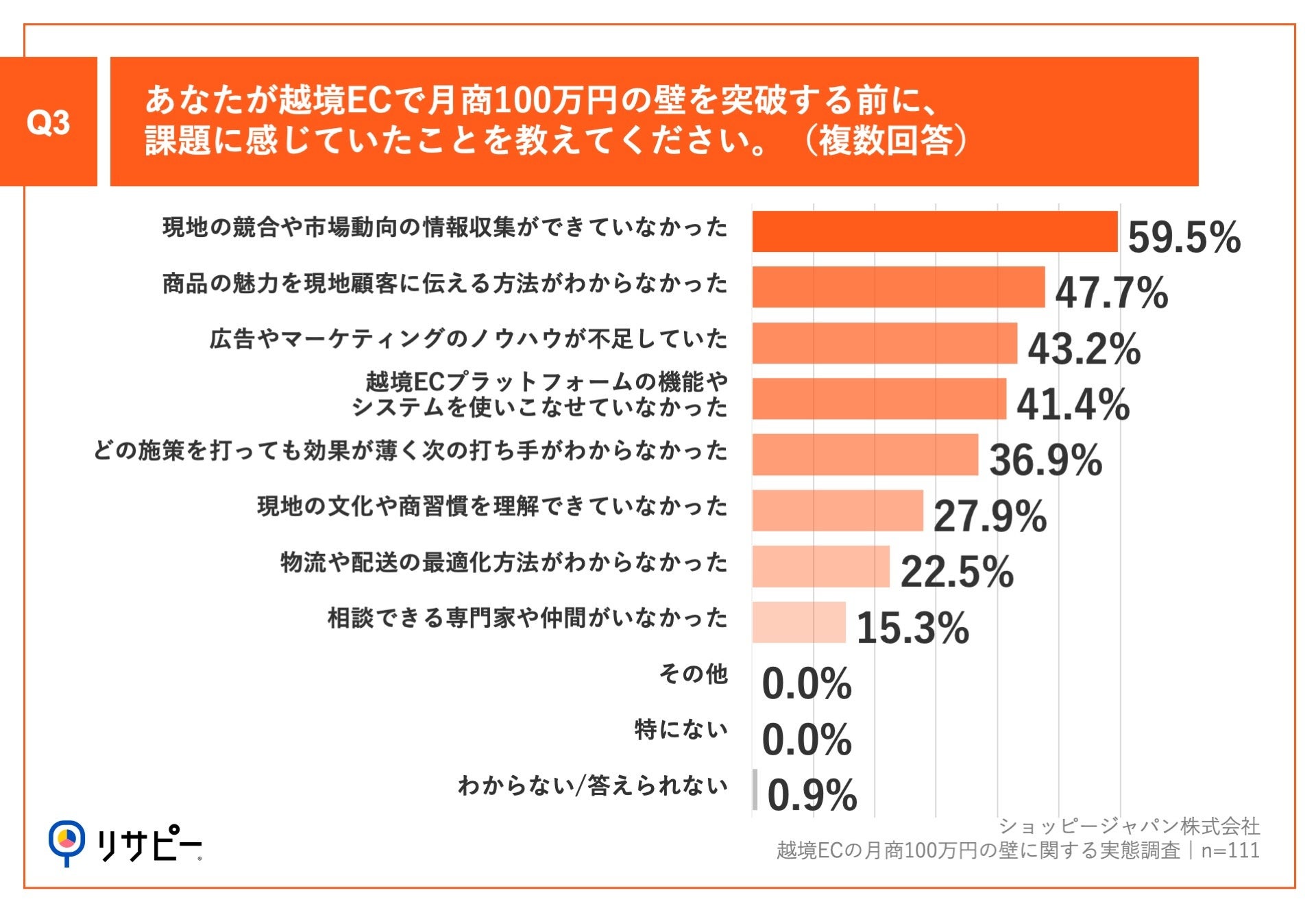 「Q3.あなたが越境ECで月商100万円の壁を突破する前に、課題に感じていたことを教えてください。(複数回答)」(n=111)と質問したところ、「現地の競合や市場動向の情報収集ができていなかった」が59.5%、「商品の魅力を現地顧客に伝える方法がわからなかった」が47.7%、「広告やマーケティングのノウハウが不足していた」が43.2%という回答となりました。