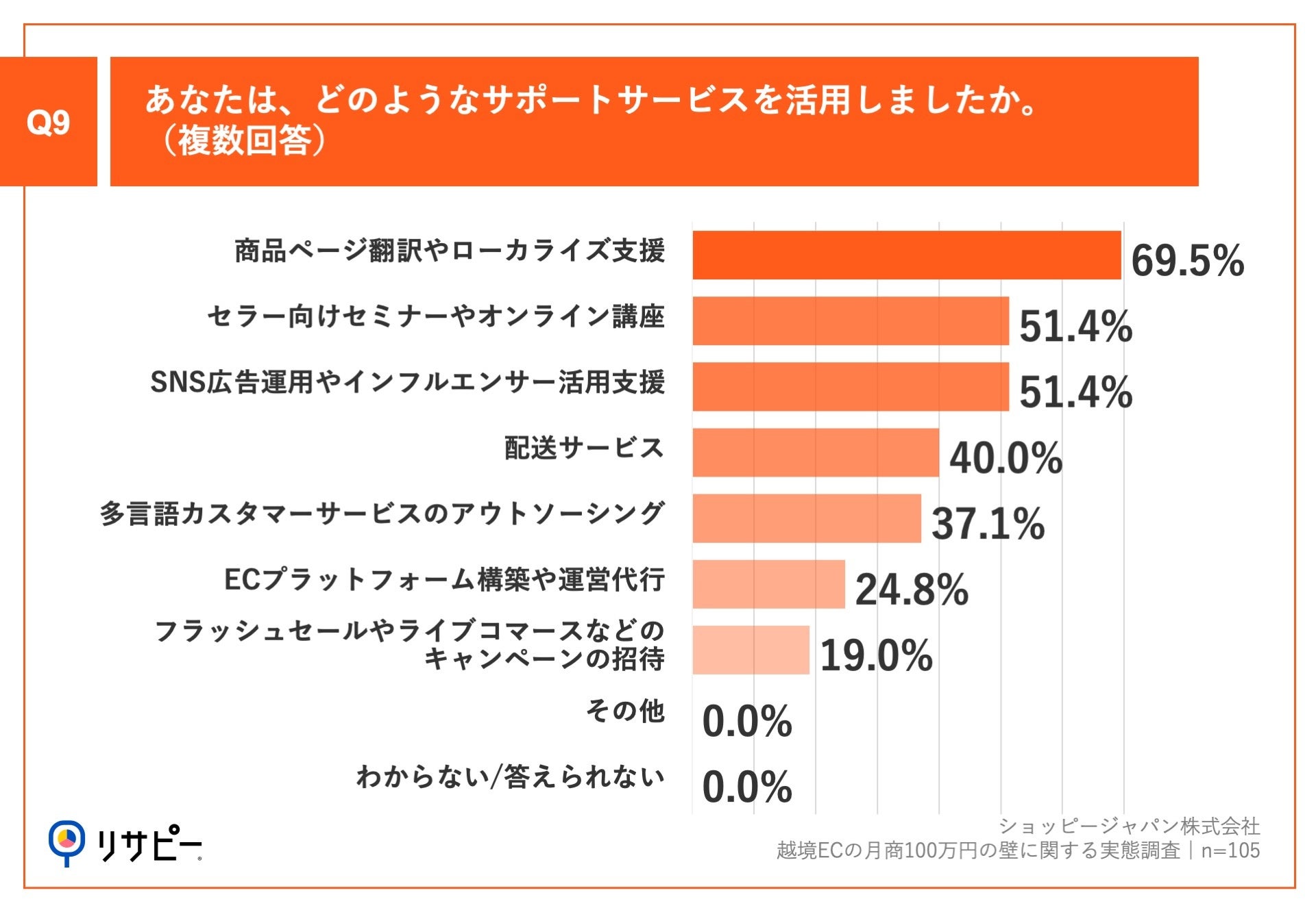 Q8で「積極的に活用した」「必要に応じて活用した」と回答した方に、「Q9.あなたは、どのようなサポートサービスを活用しましたか。(複数回答)」(n=105)と質問したところ、「商品ページ翻訳やローカライズ支援」が69.5%、「セラー向けセミナーやオンライン講座」が51.4%、「SNS広告運用やインフルエンサー活用支援」が51.4%という回答となりました。