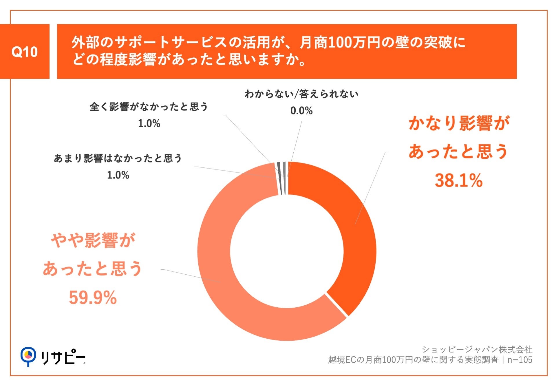 Q8で「積極的に活用した」「必要に応じて活用した」と回答した方に、「Q10.外部のサポートサービスの活用が、月商100万円の壁の突破にどの程度影響があったと思いますか。」(n=105)と質問したところ、「かなり影響があったと思う」が38.1%、「やや影響があったと思う」が59.9%という回答となりました。