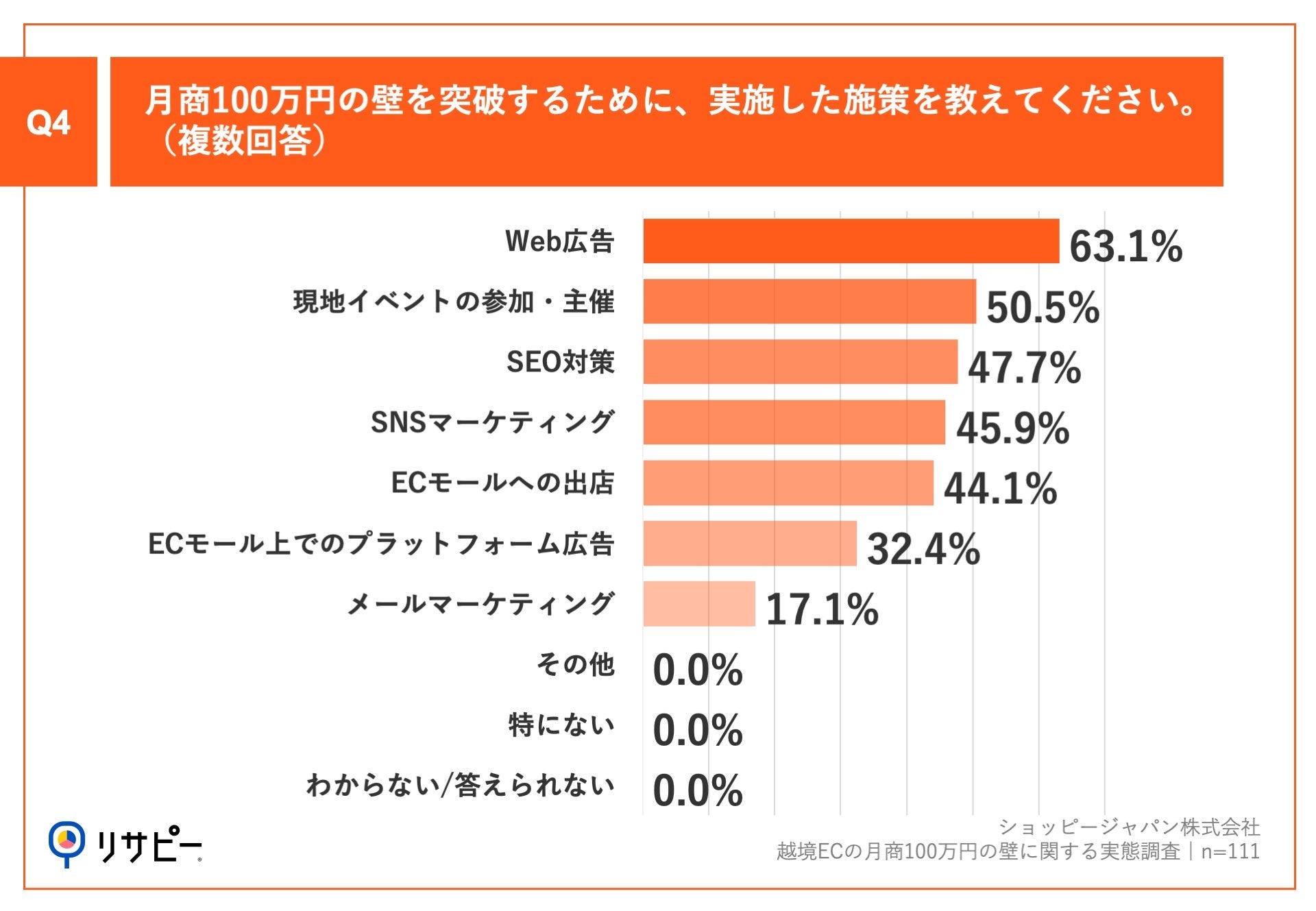 「Q4.月商100万円の壁を突破するために、実施した施策を教えてください。(複数回答)」(n=111)と質問したところ、「Web広告」が63.1%、「現地イベントの参加・主催」が50.5%、「SEO対策」が47.7%という回答となりました。