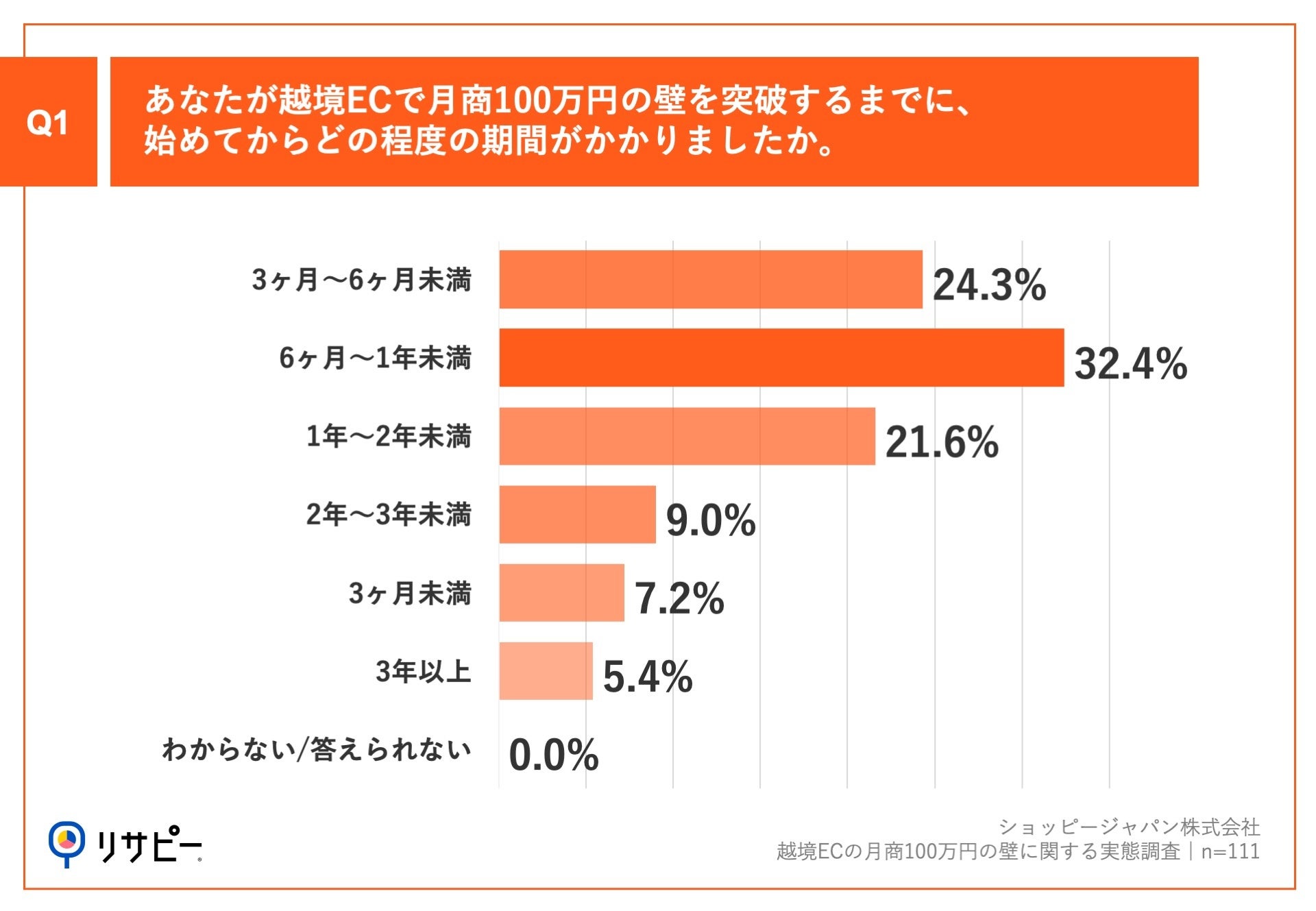 「Q1.あなたが越境ECで月商100万円の壁を突破するまでに、始めてからどの程度の期間がかかりましたか。」(n=111)と質問したところ、「6ヶ月~1年未満」が32.4%、「3ヶ月~6ヶ月未満」が24.3%、「1年~2年未満」が21.6%という回答となりました。