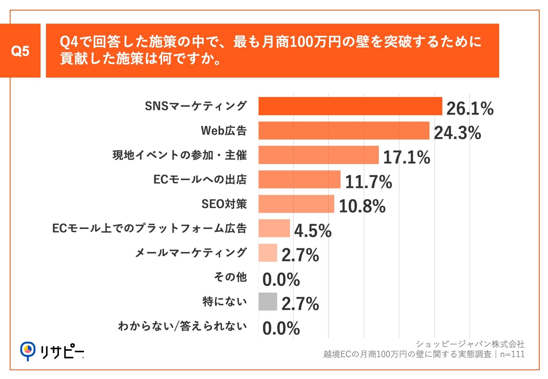 Q4で「特にない」「わからない/答えられない」以外を回答した方に、「Q5.Q4で回答した施策の中で、最も月商100万円の壁を突破するために貢献した施策は何ですか。」(n=111)と質問したところ、「SNSマーケティング」が26.1%、「Web広告」が24.3%、「現地イベントの参加・主催」が17.1%という回答となりました。