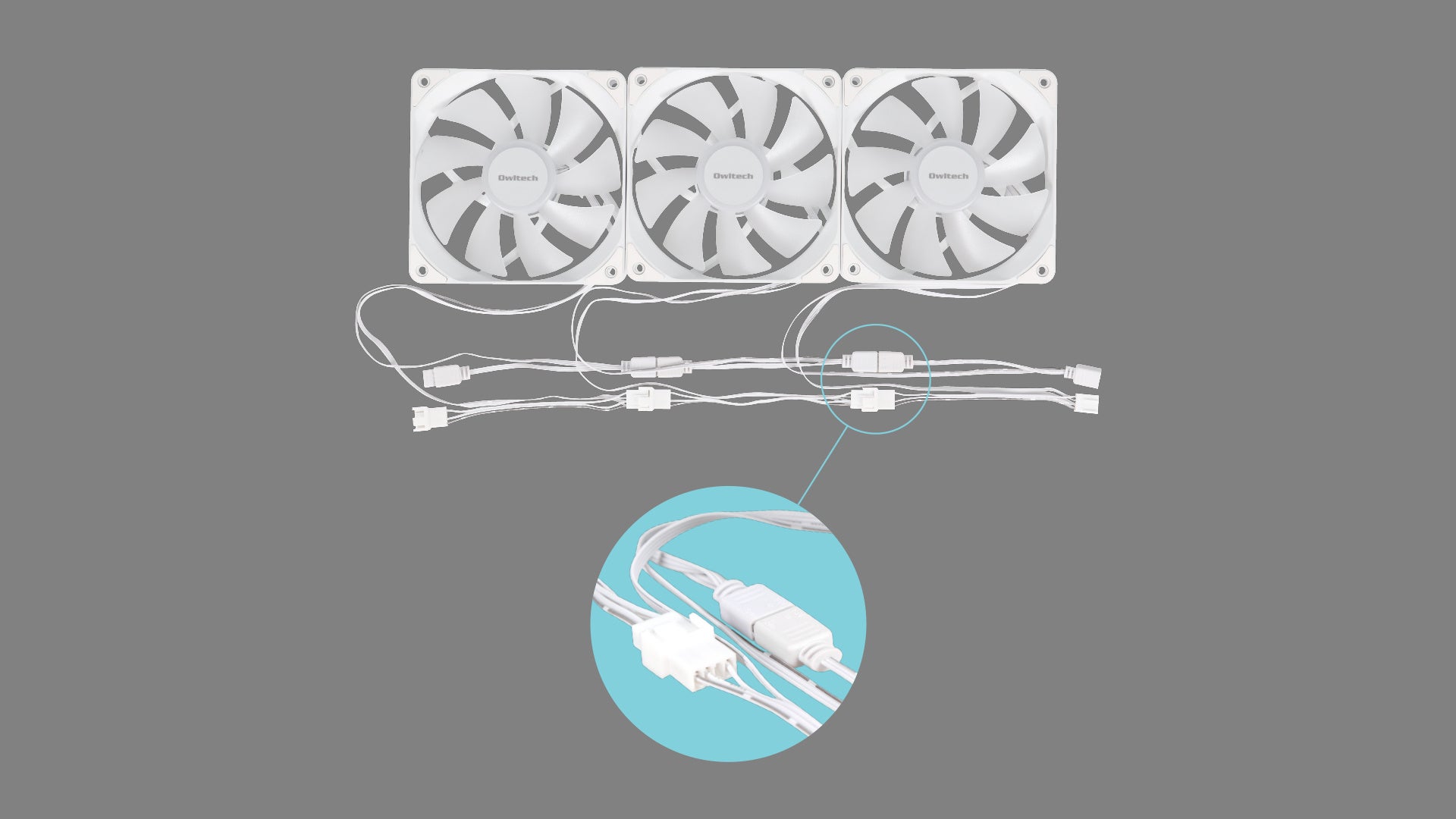 デイジーチェーン(数珠繋ぎ)接続に対応しているため、コネクタ1つで複数のファンを連結して接続できます。配線のアレンジもしやすくなり、回転数やライティングの一括制御も可能です。