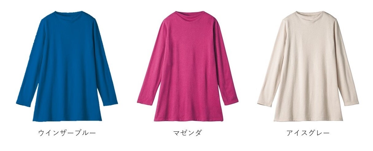 11月30日にリリース配信した新商品、『【日本製】スマイルコットン®ハイネックカットソー』のシリーズ、『【日本製】スマイルコットン®ボトルネックカットソー』も大変おすすめです!特徴は、お顔まわりをすっきり見せる低めのボトルネック。衿元を折り返し仕様にすることで、縫い代が首元にあたりにくい設計にしています。ヒップが隠れる丈感と、ゆるやかなAラインが素材のやわらかさと相まってやさしい印象に。Mサイズ1着当たり196gと軽く、素材の美しさと華やぎカラーで上品なたたずまいを演出します。