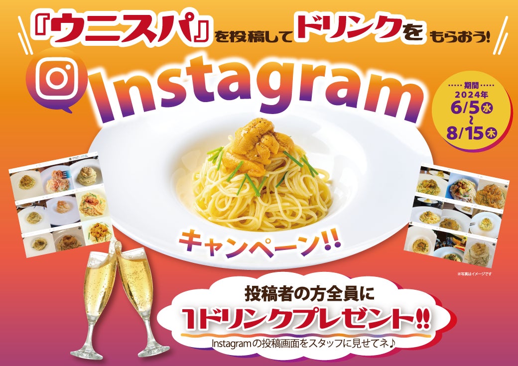 【キャンペーン!】1ヶ月販売数、姉妹店累計2万食!「北海道産塩水ウニの冷製スパゲティ」をinstagramに投稿して1ドリンクをゲットしよう!