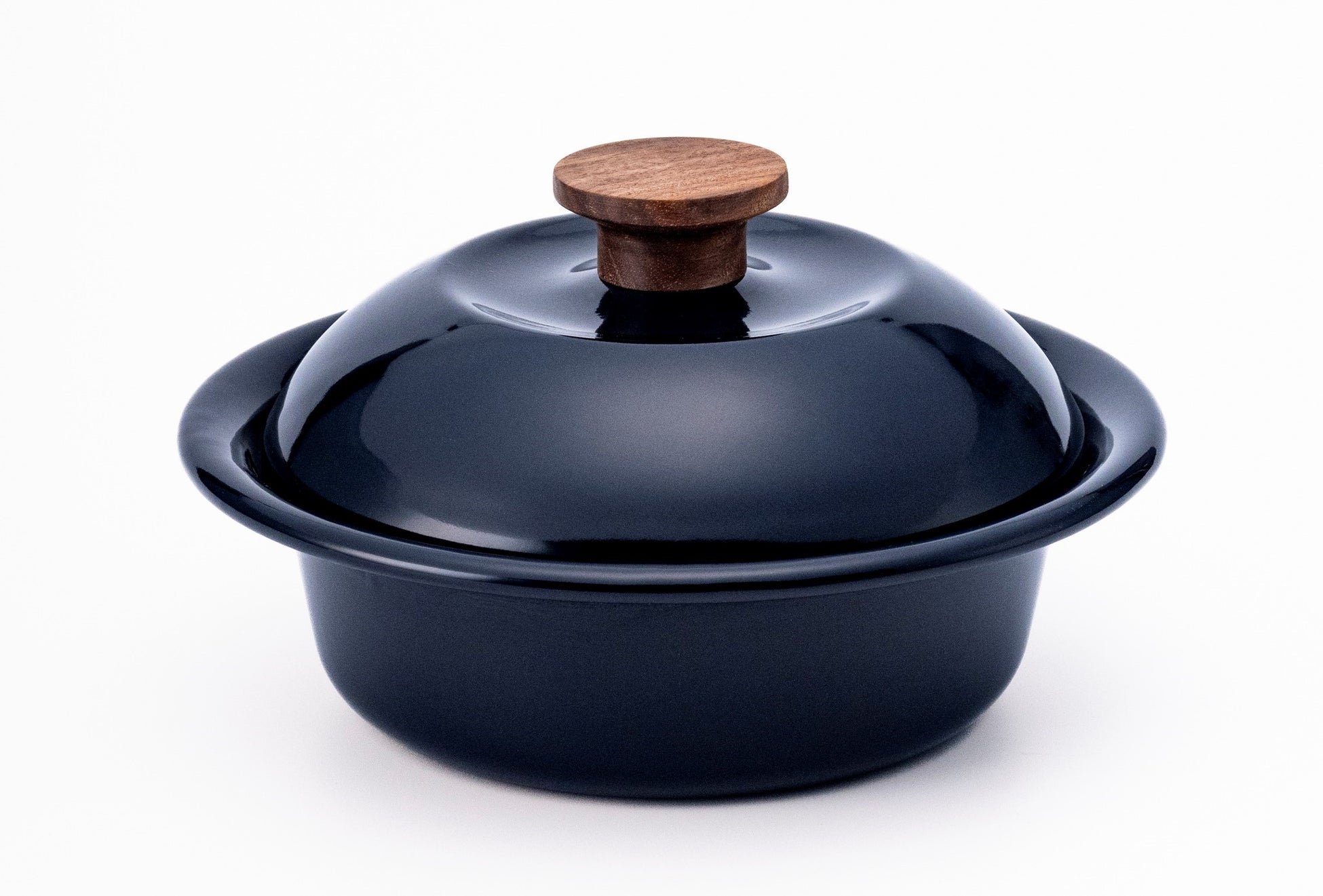 釉薬は、野田琺瑯が試作を重ねて調合してくださった、茅乃舎だけの鉄紺色。台所に出しっぱなしでも雰囲気よくまとまります。温かみを感じるウォールナット材のつまみも、茅乃舎独自の仕様です。