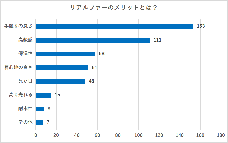 リアルファーのメリットについて伺ったところ、「手触りのよさ」が一番多くの票数を集める結果となりました。