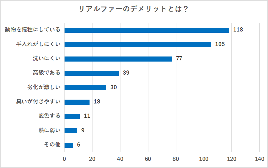 リアルファーのデメリットについて伺ったところ、「動物を犠牲にしている」が一番多くの票数を集める結果となりました。