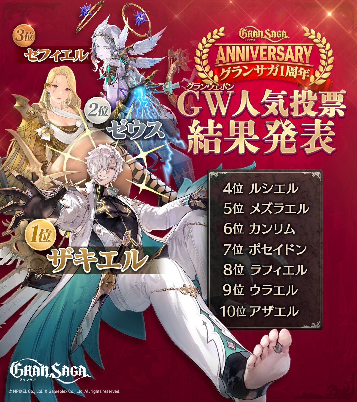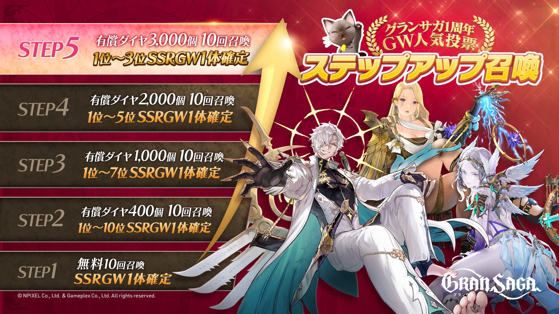 株式会社NPIXELは、本日実施されたシネマティックオンラインRPG 「グランサガ(Gran Saga)」(運営:株式会社GAMEPLEX)のアップデートにて、1周年を記念した「1周年記念人気投票グランウェポン ステップアップ召喚」を開催いたしました。ユーザーの皆様に頂いた人気投票の結果を反映した召喚となり、1回目は無料で10回召喚を行うことができます!