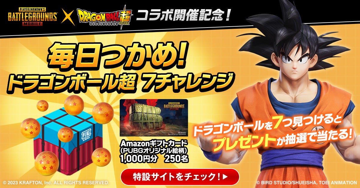 コラボレーションを記念して開設された特設サイトでは主要情報の他、スペシャツコンテンツとして「毎日つかめ!ドラゴンボール超 7チャレンジ」を参加することができ、チャレンジ結果を自身のSNSで投稿するとAmazonギフトカード1,000円分が当たるキャンペーンに応募することができます。当コンテンツは9月4日(月)までお楽しみいただけます。