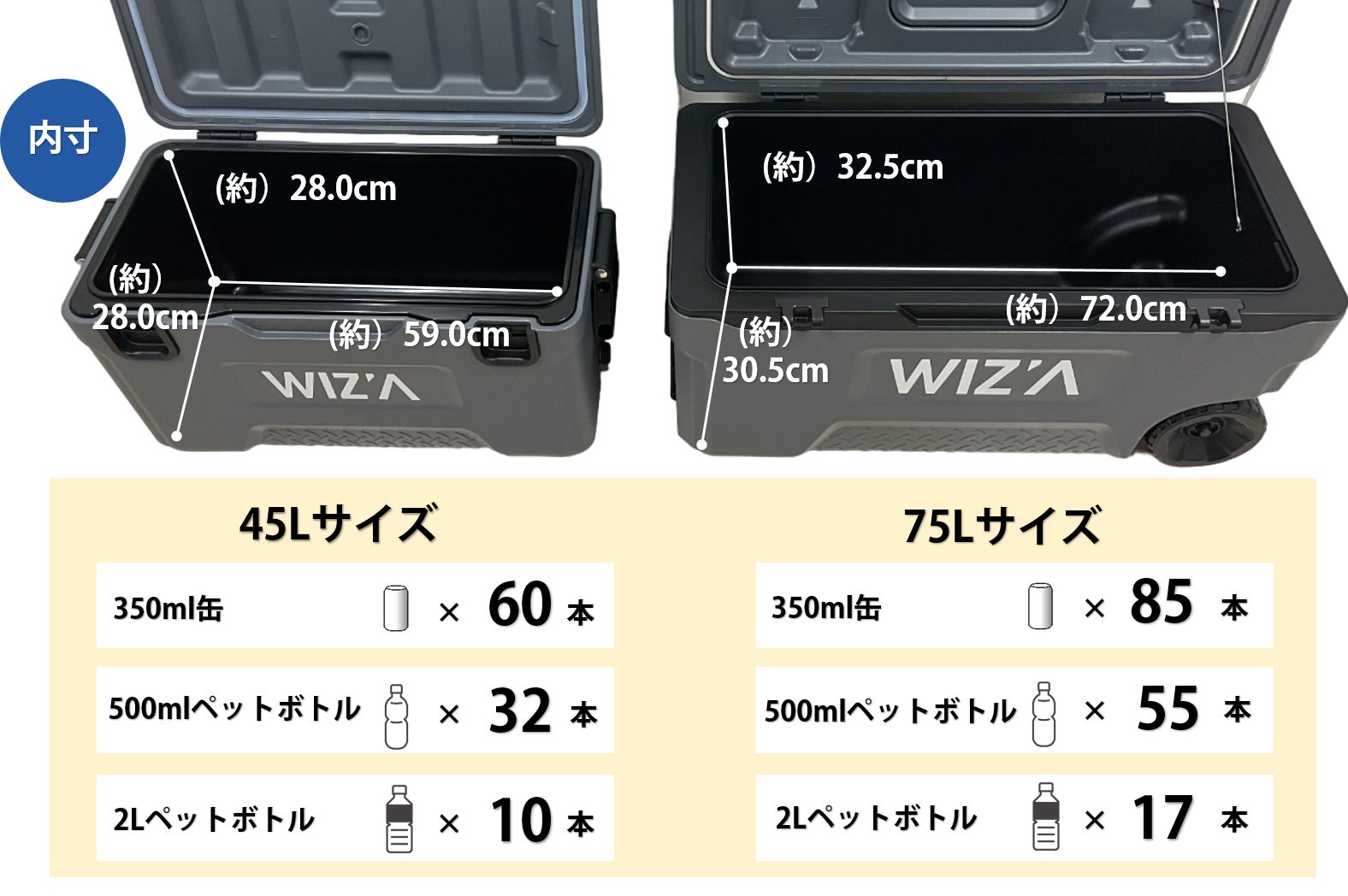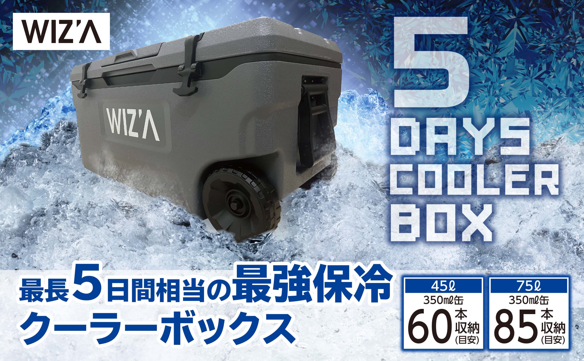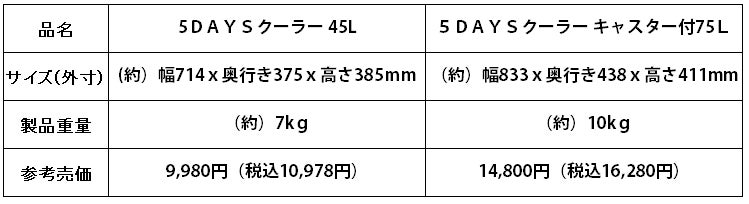 高性能の保冷機能を備えた「5DAYSクーラー」は45Lと75Lの2種類を展開します。それぞれにドリンクホルダーとサイズ計測簡易メジャーが付いています。
