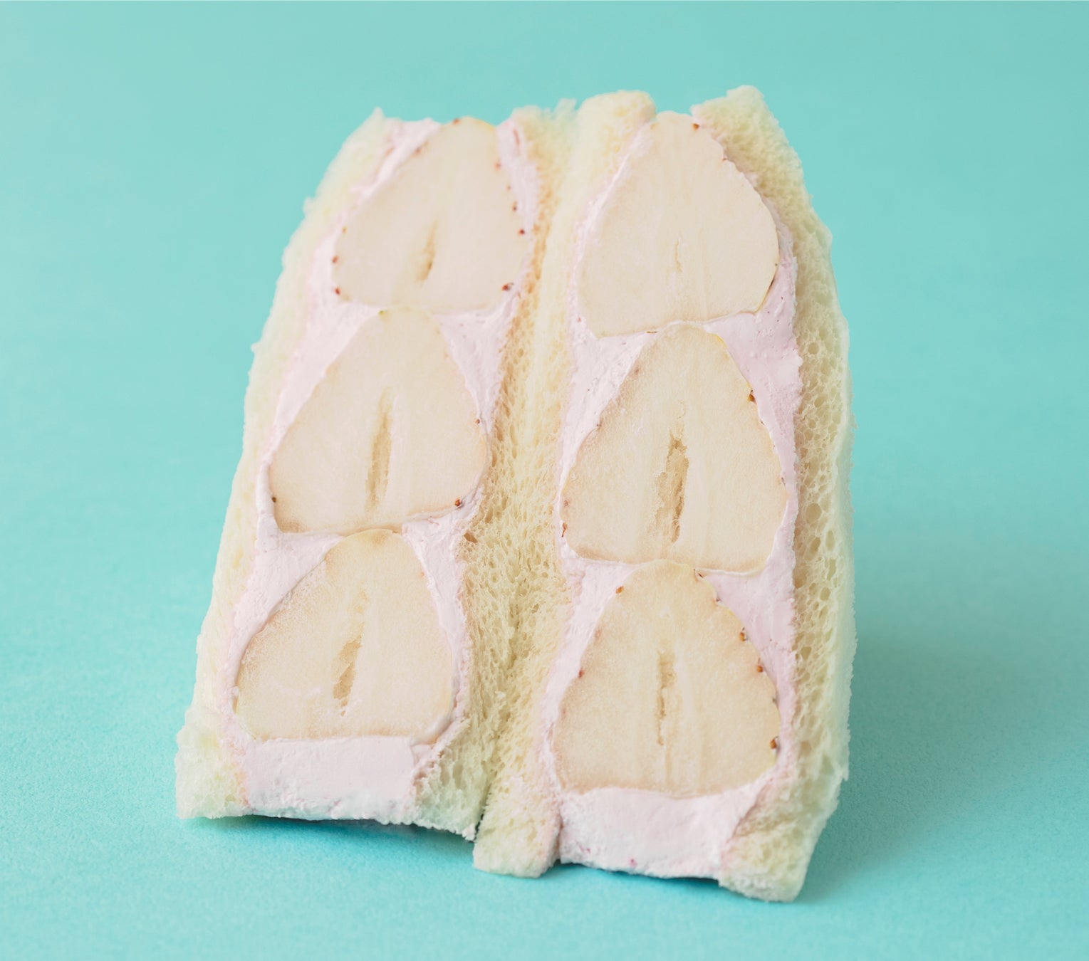 ピンク色のラズベリークリームで白いちごをサンド。可愛らしい見た目のサンドイッチです。
