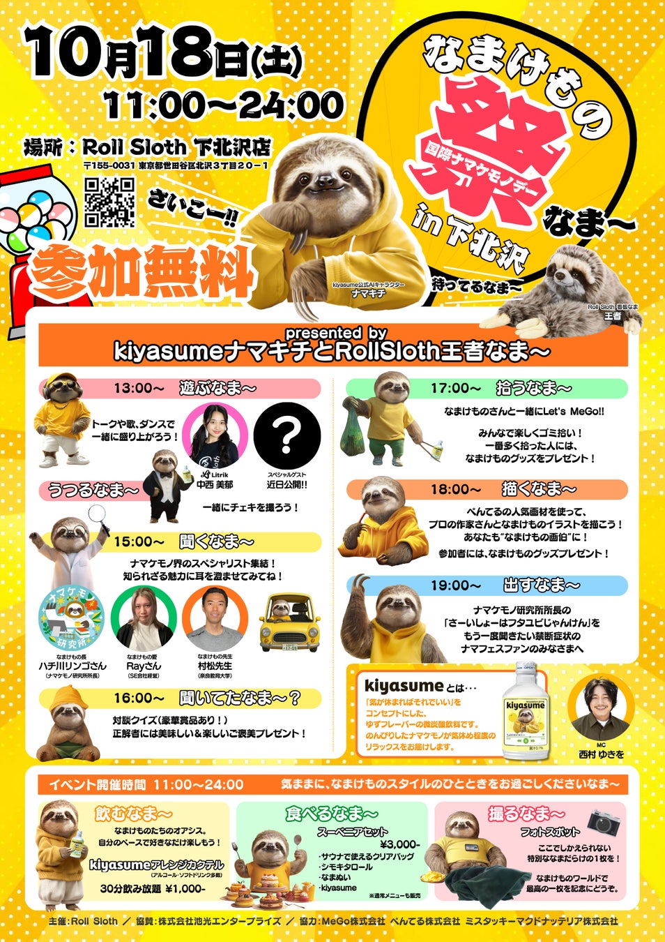 本イベントはその国際ナマケモノデーを記念し、kiyasume公式AIキャラクター・ナマキチとRoll Sloth看板なま・王者がタッグを組み、丸一日“なまけもの尽くし”でお届けする1日。