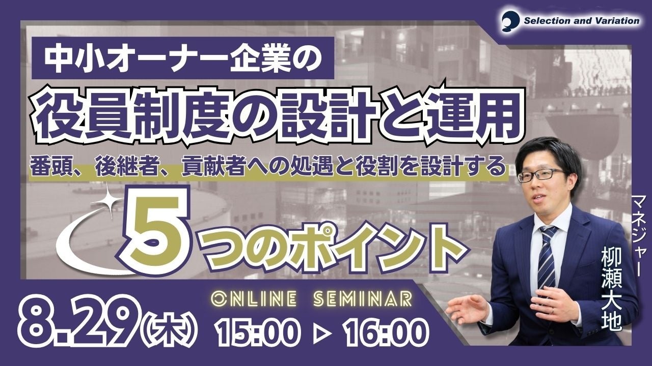 組織・人事コンサルティングファームであるセレクションアンドバリエーション株式会社(以下、当社、東京都千代田区丸の内、東京都港区青山、大阪市西区、名古屋市西区 / 代表取締役社長:平康慶浩/ URL:https://sele-vari.co.jp/ )は中小オーナー企業の役員制度の設計と運用 ~番頭、後継者、貢献者への処遇と役割をどう設計するべきか~セミナーを2024年8月29日(木)15:00〜16:00に開催することをお知らせいたします。