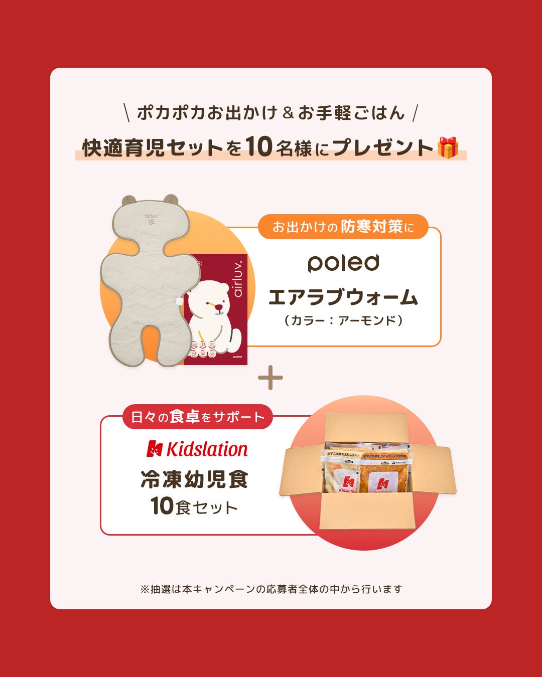 本キャンペーンでは、厳しい冬の寒さからお子様を守る送風機付きクールシートの冬モデル「エアラブウォーム2」と、忙しい日々の食事作りをサポートする「Kidslation 冷凍幼児食 10食セット」を抽選で10名様にプレゼントいたします。