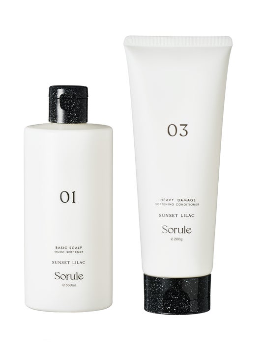 ソルレのヘアケアラインが提案するのは「大人の髪のためのとろみ保湿ケア」。独自のとろみで頭皮と髪にうるおいを補給し、軽やかな頭皮となめらかな髪に導いてくれます。シャンプー「モイストソフナー」は地肌の状態に、コンディショナー「ソフニングコンディショナー」は髪のダメージの状態にあわせて選べる各3タイプを展開。自分自身の状態にあわせて必要なものを選択できるフリーペア設計となっています。なかでも人気の組み合わせ「モイストソフナー 01ベーシックスカルプ」×「ソフニングコンディショナー 03ヘビーダメージ」にこの度、数量限定で「サンセットライラックの香り」が仲間入りいたします。