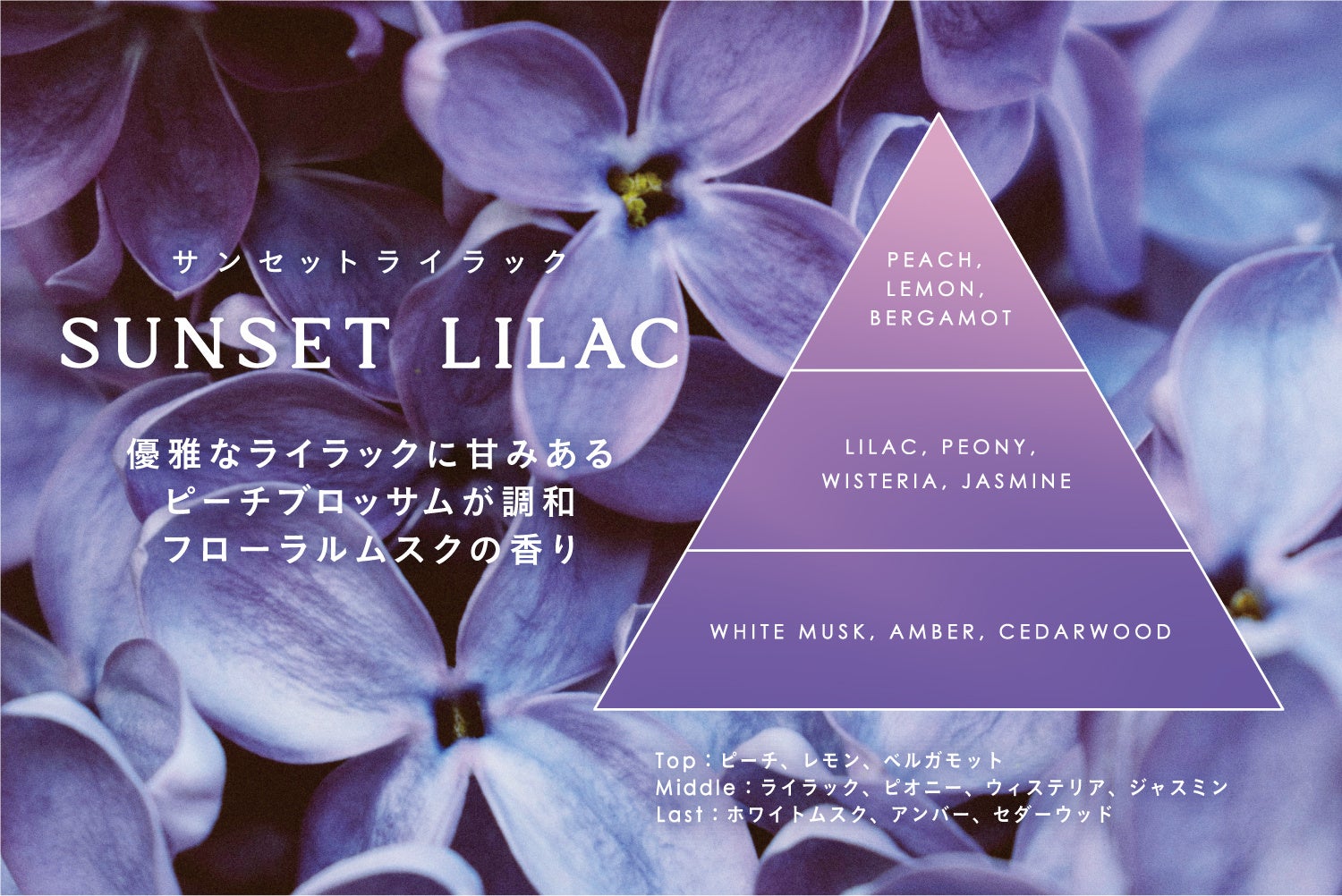 ローンチ時からブランド独自に調合した“心をときほぐす香り”を大切にしたアイテムづくりを行ってきた「ソルレ」。限定の「サンセットライラックの香り」は、優雅なライラックに甘みのあるピーチブロッサムが加わったフローラルムスクの香りで、ソルレのヘアケアライン共通の香り「ミッドナイトフィグ」と一緒にお使いいただいても調和する、やわらかで心安らぐ香りとなっております。上質な香りで満たされるバスタイムを、ぜひお楽しみください。