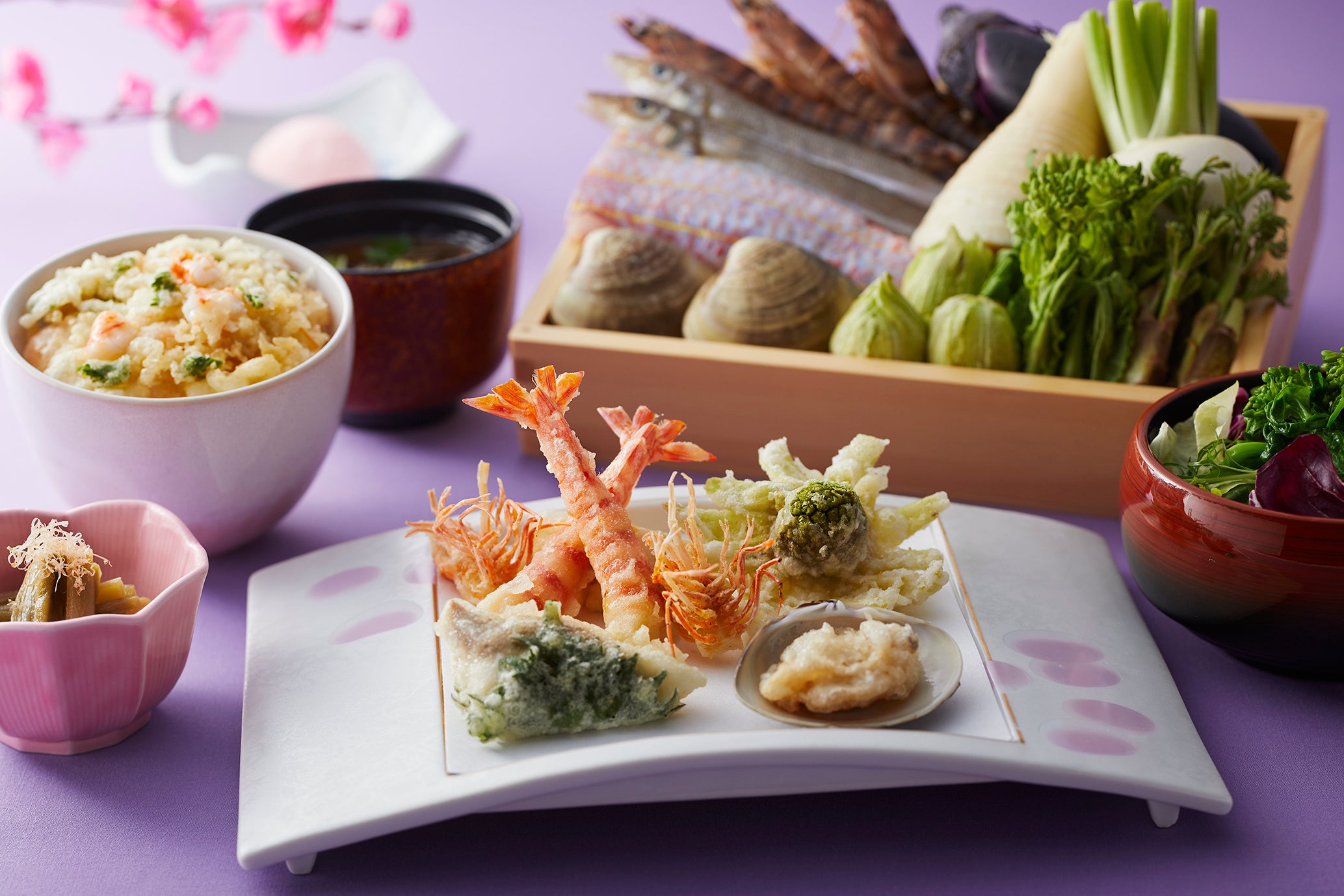 貝殻ごと揚げた蛤に、ふきのとうや鯛の大葉巻きなど、春を感じる食材たちを軽やかな薄衣に閉じ込めました。