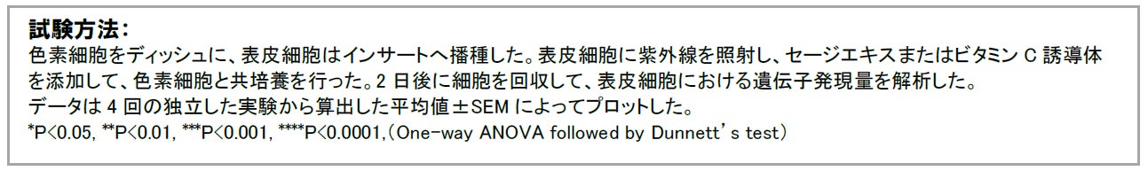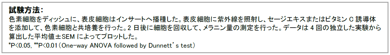 セージエキス及びビタミンC誘導体が表皮細胞を介してメラニン生成を抑制するのか確認しました。表皮細胞にセージエキスまたはビタミンC誘導体を添加し、色素細胞と共培養することにより、色素細胞におけるメラニン生成が抑制されました(図2)。このことから、セージエキス及びビタミンC誘導体は表皮細胞においてメラニン生成に関与する命令物質の産生を抑え、メラニン生成を防いでいることが分かりました。