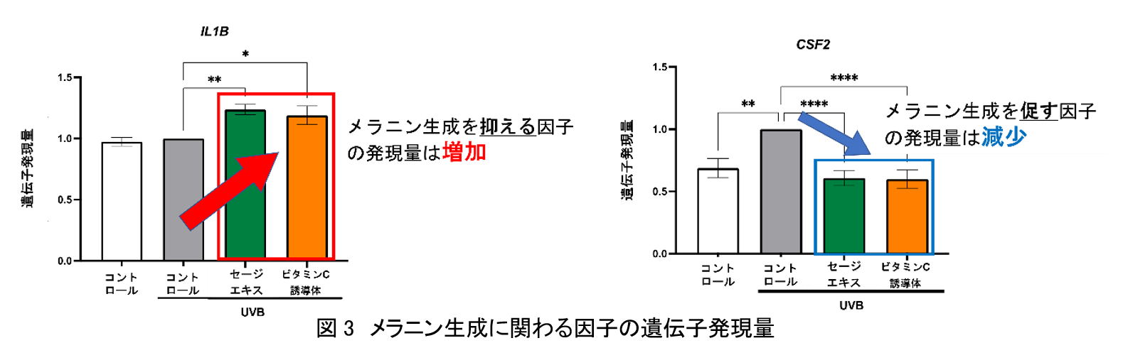 セージエキスが表皮細胞を介してメラニン生成を抑制するメカニズムを特定するため、表皮細胞の遺伝子の発現量を解析しました。その結果、メラニン生成を促す因子「CSF2」の遺伝子発現量はセージエキスによって減少し、メラニン生成を抑制する因子「IL1B」の遺伝子発現量は増加していました(図3)。興味深いことに、これらの因子はビタミンC誘導体によっても発現量が調節されており、ビタミンC誘導体の新たな作用メカニズムも発見しました。