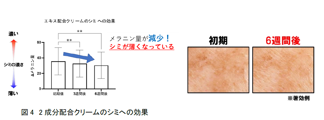 セージエキスとビタミンC誘導体を配合したクリームを用いて30~50代の女性の頬部のシミへの効果を確認しました。2成分を配合したクリームをシミ部位に6週間塗布し続けた結果、使用前と比較して、シミが薄くなったことが確認できました(図4)。セージエキスとビタミンC誘導体を組み合わせることが、シミ対策に有効であることが示されました。