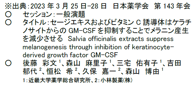 ○タイトル:セージエキスおよびビタミンC誘導体はケラチノサイトからのGM-CSFを抑制することでメラニン産生を減少させる Salvia officinalis extracts suppress melanogenesis through inhibition of keratinocyte-derived growth factor GM-CSF