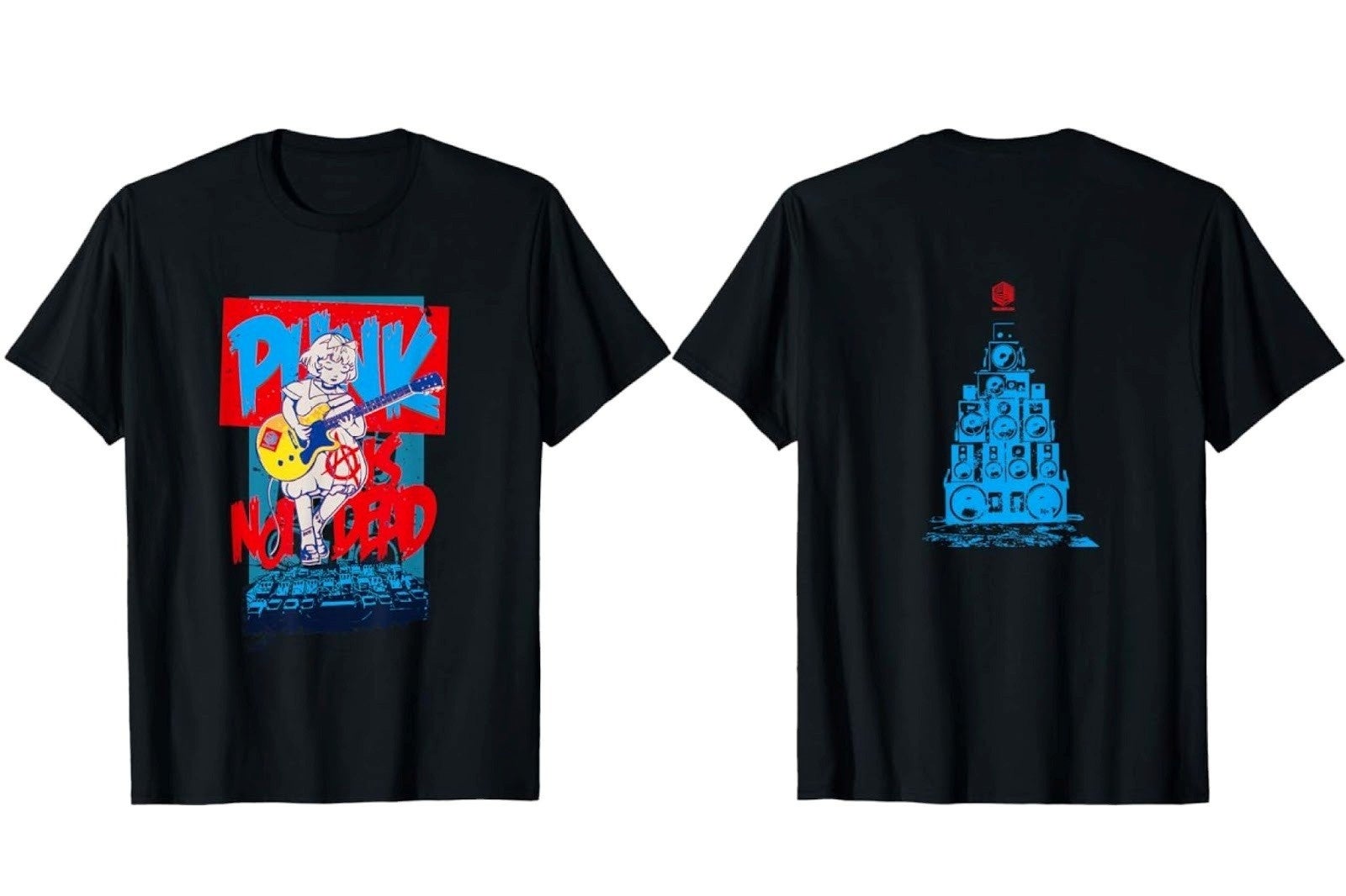 「Punk is not dead」というお馴染みのフレーズとともに、シンプルなロックンロールにお似合いのギブソン「レスポールJr」をオマージュ! シングルではなく、ダブルカッタウェイにしたのがミソ! バックプリントには、これでもか! とアンプを積み上げました。