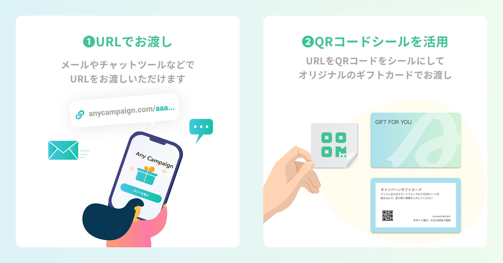URLをQRコードにしたシールでのお渡しも可能です。QRコードを読み込み、お名前や住所を登録するだけでギフトの受け取りが可能です。QRコードをシールにすることで、オリジナルのギフトカードとしてご活用いただけます。