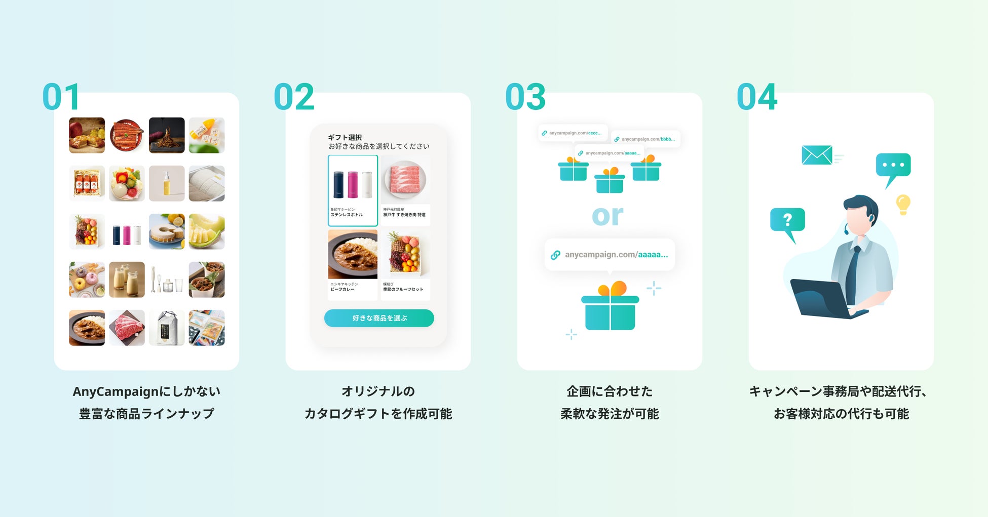 5,000種類以上の商品からお好きな商品を選択することが可能です。和牛・海鮮・野菜などの食品や、料理グッズや食器などの雑貨など、AnyCampaignにしかない商品を多数取り揃えております。最安100円から最大100万円まで、幅広い単価でも展開可能です。