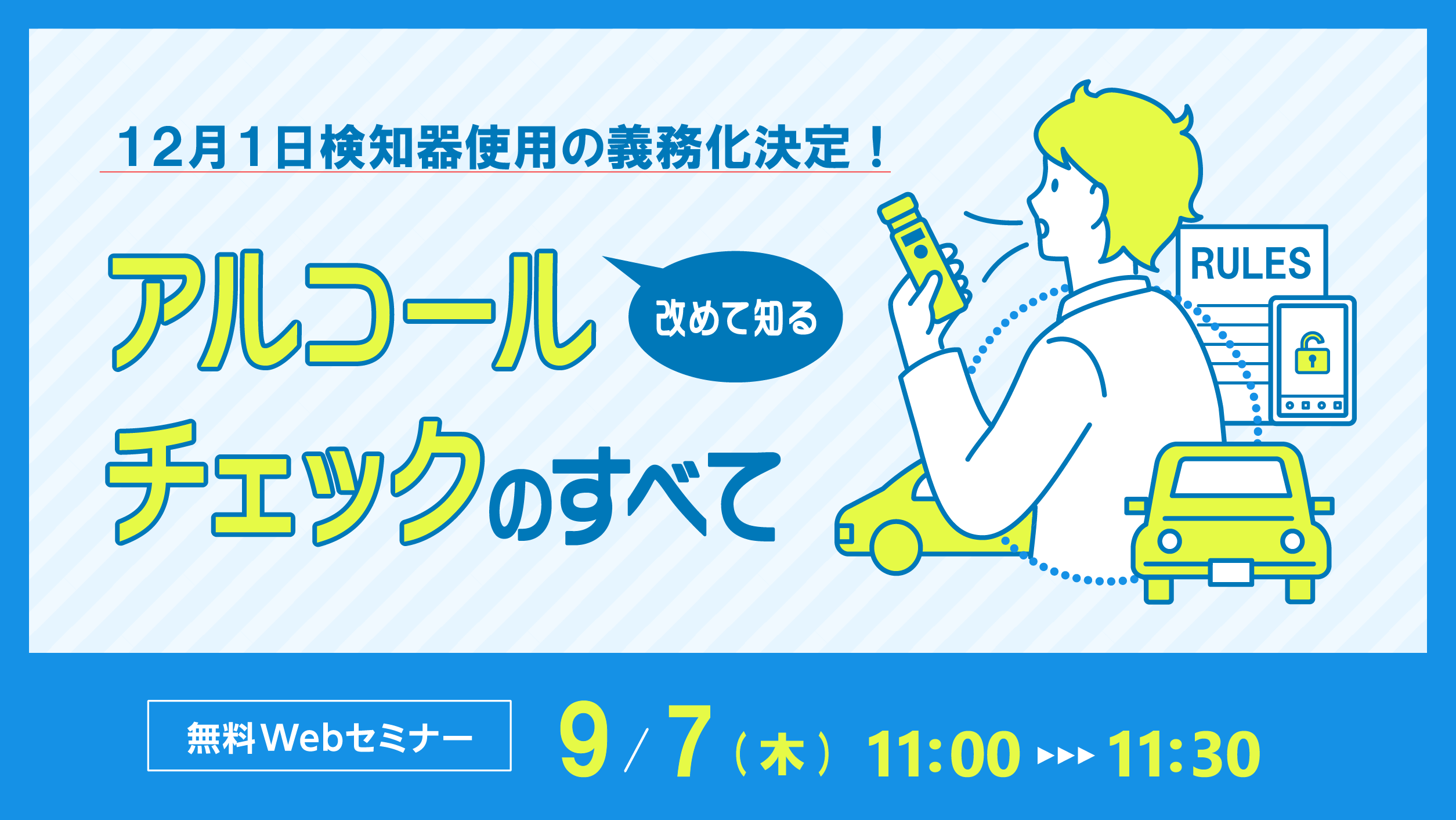 株式会社東海理化は、社用車管理の課題を解決する DX サービス「Bqey(ビーキー)」を展開しています。8月上旬には警察庁から、「12月からアルコール検知器による飲酒検査の義務化」の決定が正式に発表されました。本発表を機に、アルコール検知器の導入についてさらに注目が高まると予想されます。本ウェビナーでは、企業や団体の総務部門の方や車両管理の担当者が知っておくべきアルコールチェック義務化の内容やアルコール検知器についてご紹介します。気軽にアルコールチェック義務化の内容やアルコール検知器の使い方を聞いてみませんか?皆様のご参加を心よりお待ちしております!