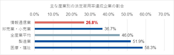 従業員が一定数以上の規模の事業主には、従業員に占める障がい者の割合を法定雇用率以上にする義務が課せられています。民間企業の法定雇用率は2.5%であり、2026年7月には2.7%へ引き上げられる予定です。企業には積極的な採用と職域開発が求められる一方で、企業が求めるスキルとのマッチングが難しいことも多く、特に情報通信業は法定雇用率達成企業の割合が平均を大きく下回っている状況(※1)です。
