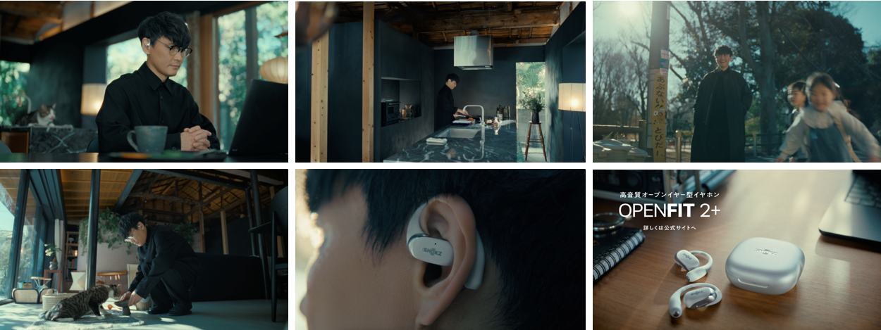 ShokzのCM初出演の山口一郎さん(サカナクション)。普段から音楽に対して向き合う山口さんが、音楽の制作環境の中、ヘッドホンで周囲の音を遮り、集中することに負担を感じる姿からスタートします。以前よりShokzのオープンイヤー型イヤホンを着用してきた彼らしいナレーションと、日常の景色や時間が盛り込まれたシーンへと移り変わっていきます。