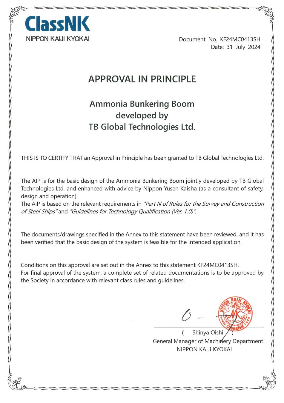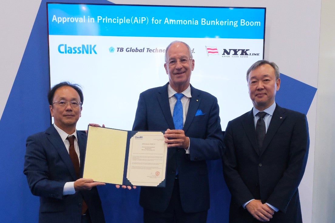 東京貿易ホールディングス株式会社(東京都中央区、代表取締役社長 坪内秀介)のグループ会社であるTBグローバルテクノロジーズ株式会社(東京都中央区、代表取締役社長 Laurent Poidevin、以下TBG)は、2024年9月17日にアメリカ合衆国 ヒューストンにて開催されたGastech 2024での授与式において、日本郵船株式会社との共同でアンモニアバンカリングブームの基本設計承認(AiP:Approval in Principal)を授与されました。この授与式は、TBGと日本郵船株式会社が共同開発したアンモニア バンカリングブームに対して、日本海事協会から世界初*のAiPを取得したことによるものです。* 自社調べ(2024年7月末時点)