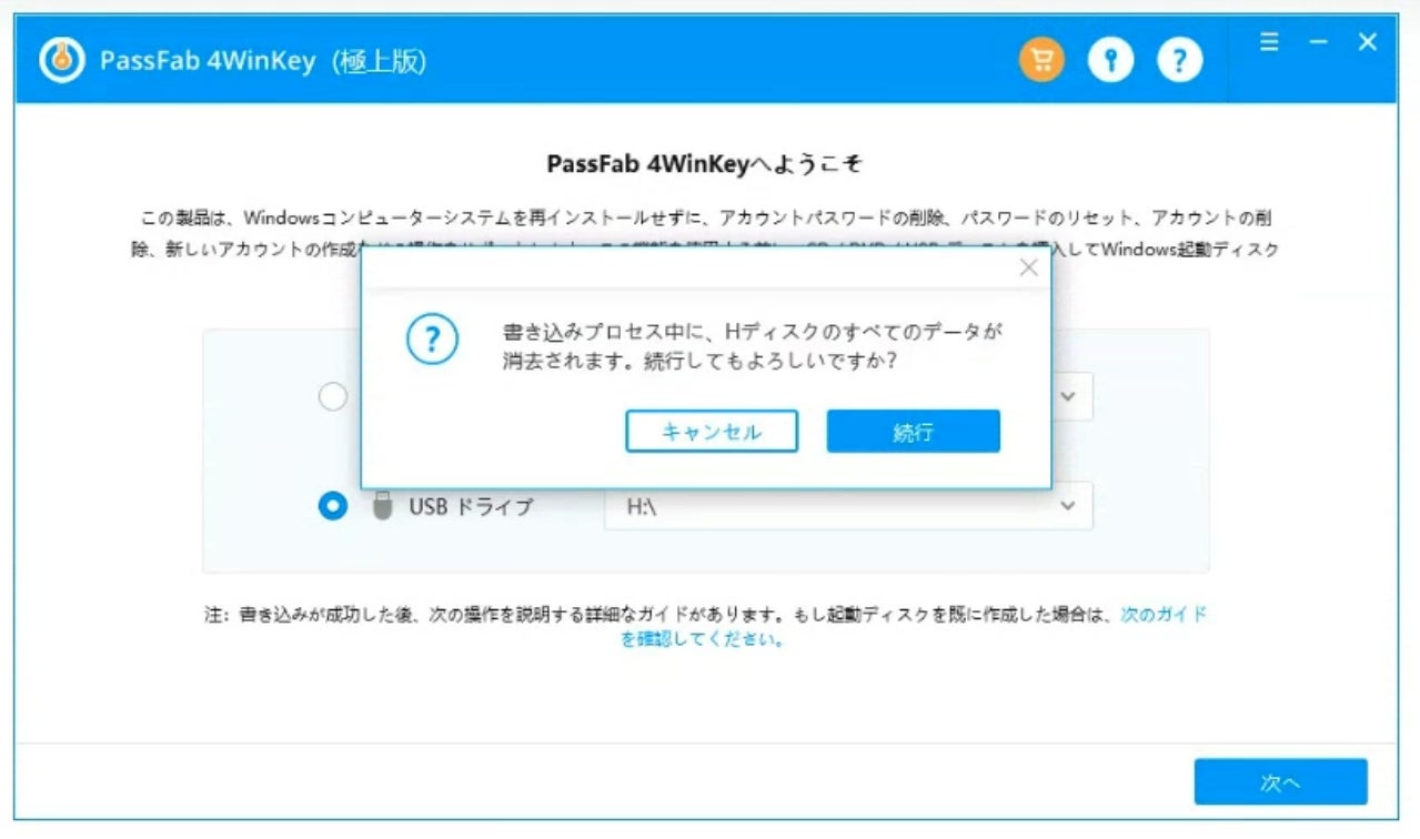 Step3:起動メディアをCD/DVDディスクまたはUSBフラッシュドライブから選択し、「次へ」をクリックし、表示されるポップアップ画面の「続行」をクリックします。