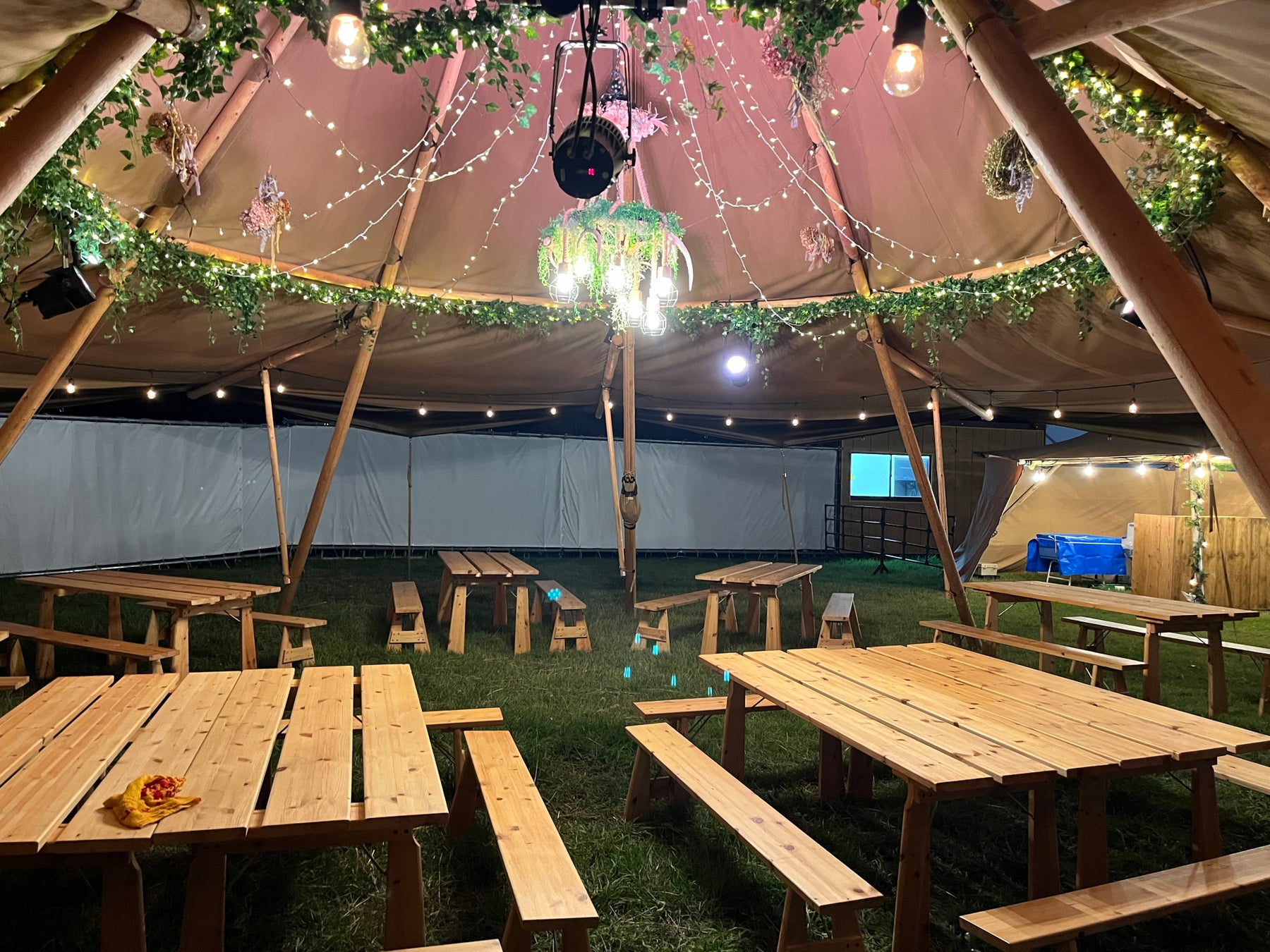 スウェーデンの住居としてのルーツを持つ大型テント、Tentipi(テンティピ)。テント内のバーカウンターでビールやワインを飲みながら、お食事もゆったりとお楽しみいただけます。
