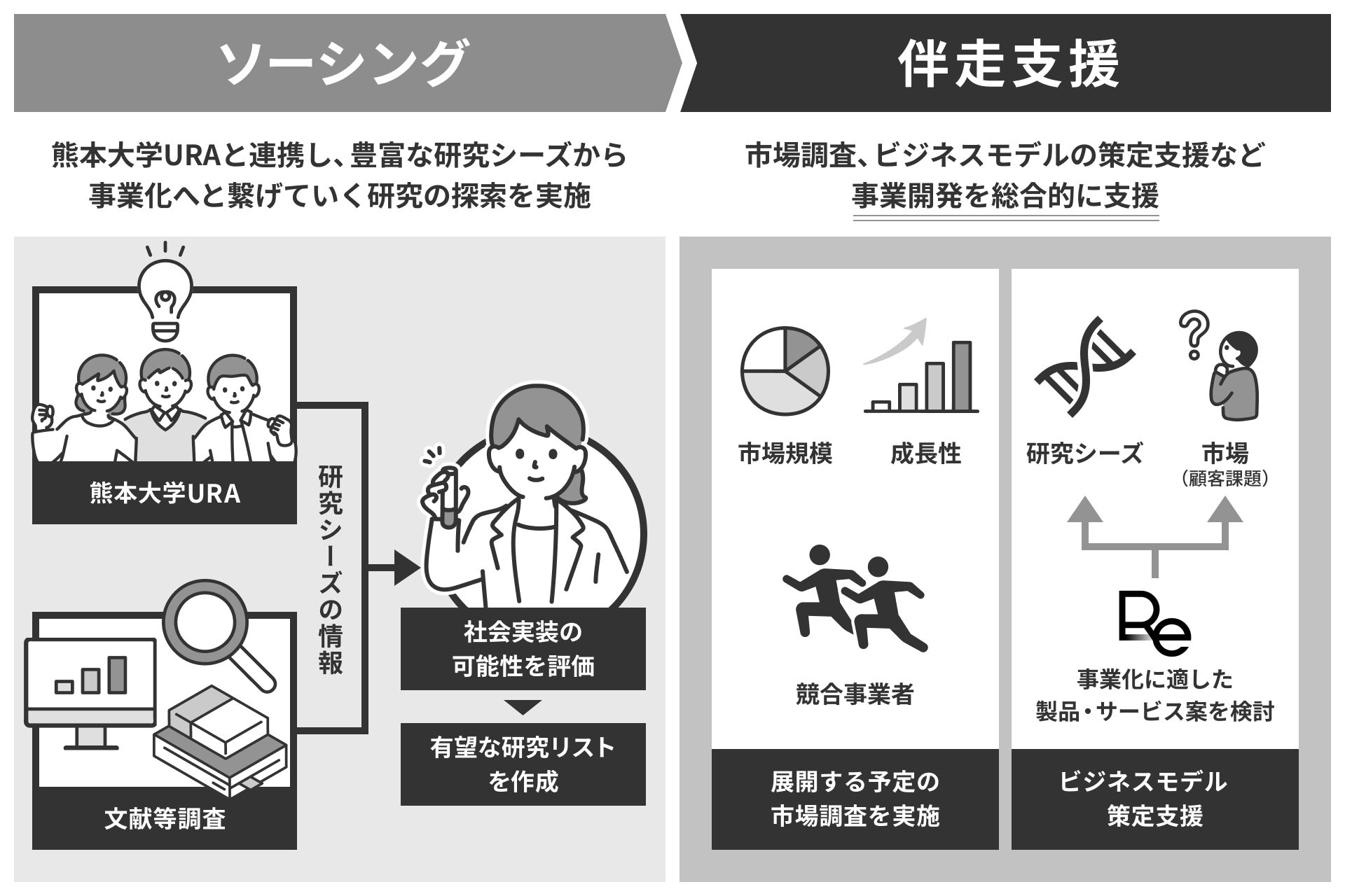 ReGACYは、学術的研究と事業化の双方に精通している強みを生かし、顧客課題や市場規模など、ソーシングの着眼点を熊本大学URAへ提供します。また、研究者へのインタビューに同伴し、研究成果等を踏まえ、社会実装の可能性を評価し、シーズリストを作成します。
