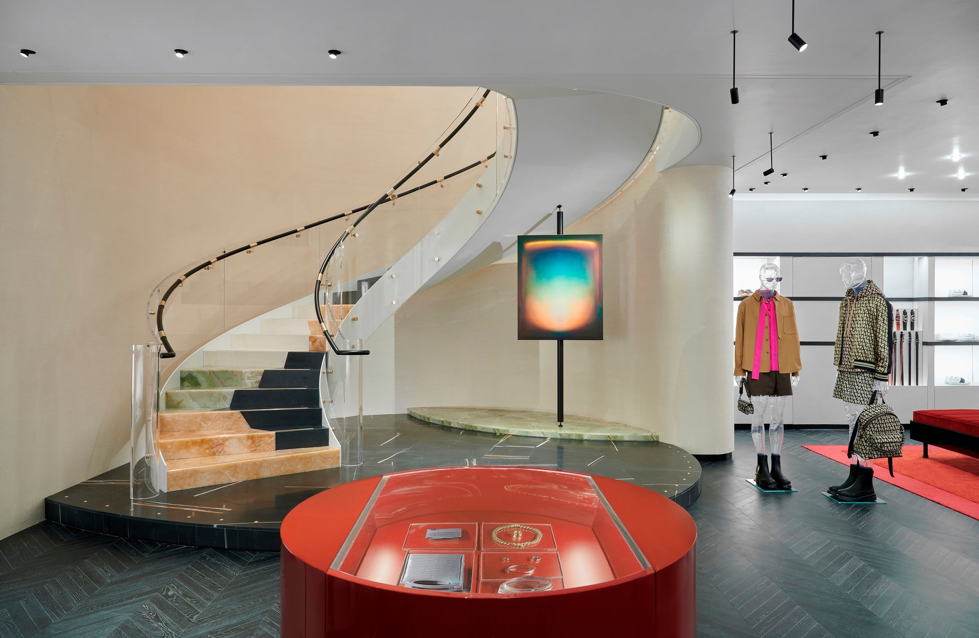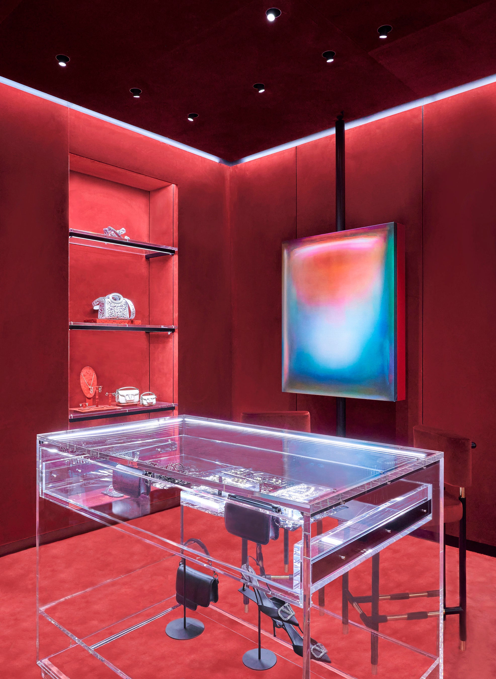 店内に配されたレッドのエレメントは、レッドカーペットを彷彿させます。ラッカーやベルベットなど、さまざまな様相のレッドが、アイボリーホワイトのインテリアデザインやミネラルトーンのアクセント、1930年代から1970年代にかけてクチュールの世界でつかわれた装飾にスパイスを与えます。大理石のパッチワークを背景にディスプレイされたドレスのはかないトレーンのように、壮大な階段の周囲には大理石やオニキス、チェッカードパターン、抽象的な幾何学模様といったローマの要素がはっきりと表現されています。