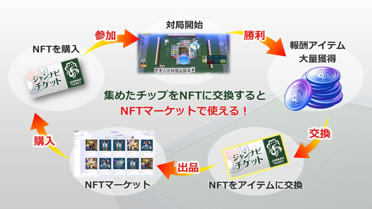 ジャンナビゲーム内で獲得したジャンナビチケットをNFTアイテムとして取り出し、お客様自ら外部のNFTマーケットプレイスにて販売することができます。