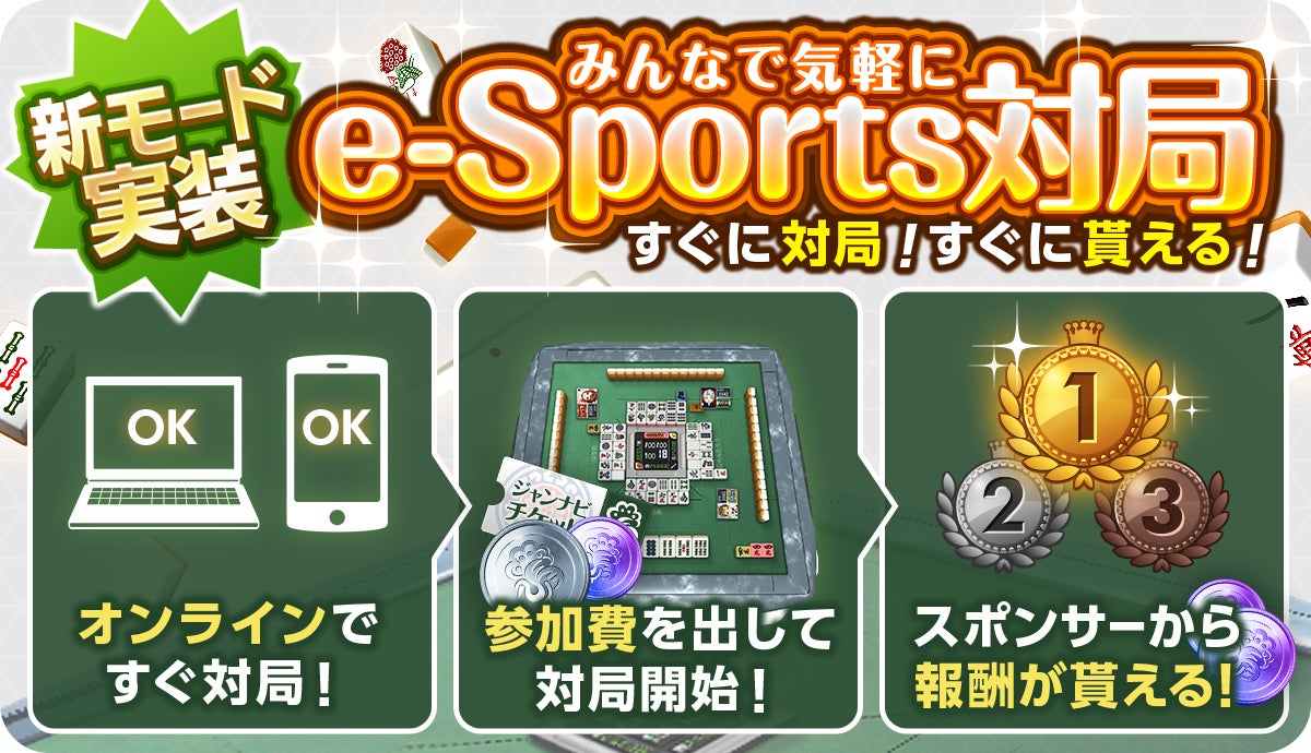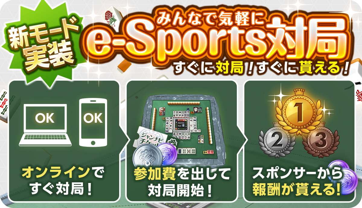 「e-Sports対局」は参加料を支払い、対局後の順位に応じてスポンサーからプラチナチップを獲得することができる普段とは違った新感覚の麻雀モードです。