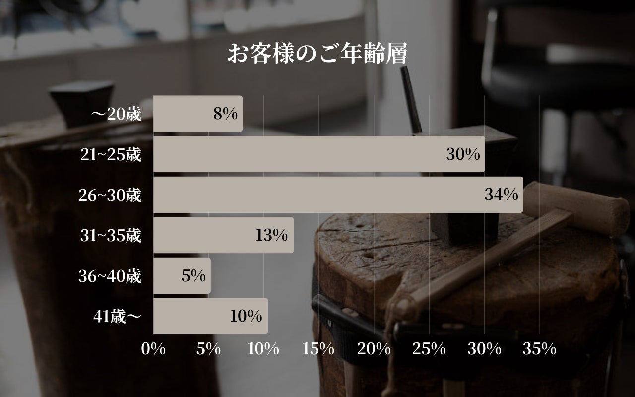今月のご利用者様の居住地を集計した結果、「都内23区」が52%と過半数を占め、最も多い層となりました。次いで「一都三県(関東圏)」が34%と続き、都内および首都圏在住のお客様で全体の86%を構成するという結果となりました。一方、「23区以外」は10%、「一都三県以外」は5%となっており、遠方からも一定数のお客様にお越しいただいていることが分かります。