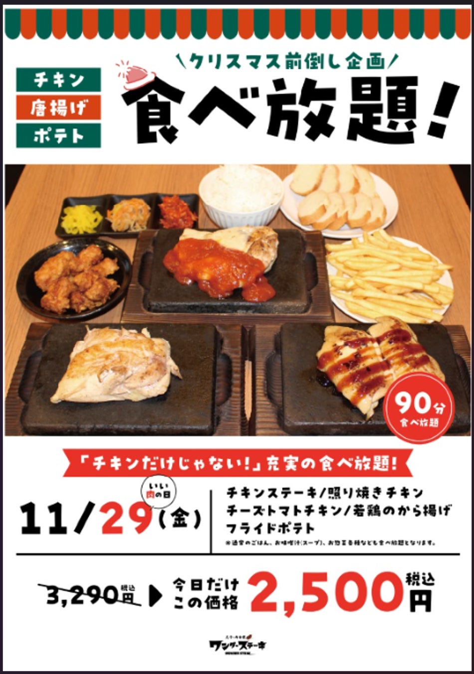 ワンダーステーキでは、今年の12月に人気が出る「チキンステーキの食べ放題企画」の開催を予定しています。そこで、今回の11月29日のニクの日には、私たちの予行演習兼、皆様にお得にステーキを食べていただきたいとの思いから、チキンステーキ食べ放題企画を実施致します。